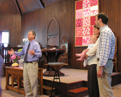 July 8, 2008 Aaaahhh... it's so nice to be settling back in to home. It was a great 2 weeks at Harrison Bay State Park with a couple hundred middle schoolers, but it sure is nice to start getting Brown back on some kind of schedule. Poor guy. He did great, but he is happy to back and dreaming beneath his mobile and getting a clean diaper change on his changing table instead of a plastic bunk pad or closest picnic table. He doesn't mind the air conditioning, either. I'm including 2 pictures of our little room we were in at Harrison Bay just to show the messy chaos we have had him in. It was actually really fun, and a good reminder of how little we really need to live on (though, as you can see, we crammed as much junk as possible into that little room! :) Sunday was a big day for Brown. He was baptized at St. Elmo Presbyterian Church. It was really sweet to have all of our family there, including Brown's Great Grandparents (THE Brown's). We are thankful for our families and the heritage that he is a part of.