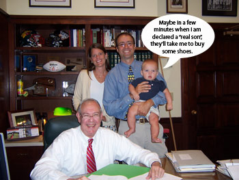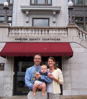August 27, 2008 Well... it's official. Today was Brown's day in court (better be his only day in court for the rest of his life - I already told him that). We met our adoption attorney at the courthouse and our appt. with Judge Thomas was at 9 AM. My mom came with us and took lots of pictures. Her first comment when she saw Brown was, "you didn't put shoes on him for the occasion?" Interestingly enough, the thought never crossed my mind. He's never worn shoes. He doesn't walk. Why would he wear shoes? But then I realized he looked like a poor, sad little baby without shoes compared to the two year old who was being adopted around the same time as us and he was in a three piece suit. I think he might should have worn shoes. Poor Brown. But as always, he was charming the ladies in the courthouse and dishing out lots of sweet smiles. They were eating him up. We went into Judge Thomas's office for the proceedings. He told us that for the last 8 months, we have not really been Brown's parents, but his guardians. And today, he is officially our son. WHAT!?! That was kind of news to me. But Curt and I figured out that if that's the case, when Brown finally gets a job his first responsibility will be to pay us back for 8 months of diapers and formula since he wasn't even our "son" during all that time. So that will be a little extra income going into our retirement fund, which will be good. All kidding aside, it really is good to have all of that behind us. Basically, now the court will apply for a Birth Certificate for Brown with his real name on it. Up until now (another thing that I forgot), we should have been calling him "Baby", because that has been his official name for the last 8 months. The only time I got choked up during the proceeding was when he asked us what the official name of our son was, and I was so happy and proud to say "Brown Barker Chaffin." I love that he has both of our family names. I love that. |