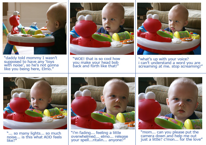 The boy loves to bounce. We really do need some taller door frames, though, because he's about to bounce down to his knees. |