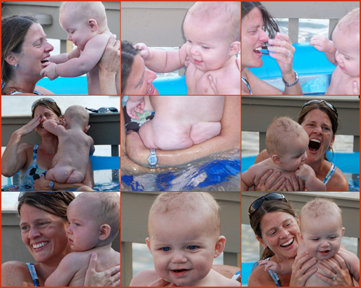 August 20, 2008 I feel like I have been really slack about writing on this thing. There have just been so many fun things happening, that I haven't taken the time to sit down and write about it. So I thought I'd play catchup real quick. August has been a fun month. Lots of play time with Brown and watching him do new things. He is sitting up so well, now. It's crazy how many doors that opens up. He really enjoys books and being read to - he was actually helping me turn the page today instead of trying to just eat the book. He loves people and watching everyone and going to different people - especially the ladies. The boy is a flirt and it is so funny to watch. I loved going to pick him up a few minutes ago from his afternoon nap. He smelled like so many different people that had been holding him and kissing on him this morning. All of Curt's coworkers at AIA and RDA were so sweet and played with him for a long time this morning and even let him nap in their office while I went to my dermatologist appt. He wasn't even doing anything but sitting there being Brown, and I was so proud of him and happy for all of these interactions he was having. As my friend Laurel described him a few months ago, "he's just so nice." Anyway... last week we were up at the lake and Marcie and Ashley took a bunch of pictures of us in the pool. I love the pictures because it is Brown in action just smiling and pulling my hair and giggling and trying to eat my face. All of that probably doesn't sound like much fun to anyone else, but I love it. I'm going to restrain myself and only put a few of those pictures on here. I know it looks like a lot, but there are about 48 of them that I really wanted to put on here.