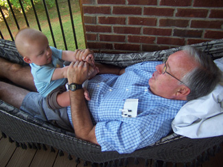 Curt's mom and dad kept Brown last night and today so that I could go to worksites. Becky just emailed this picture of Brown chilling with Granddad in the hammock. Great picture! I can't wait to see him tonight! They are bringing him out to meet up with us at the Evening Meeting at Harrison Bay State Park. All the women counselors were sad he wasn't at breakfast with us this morning so they could steal their snuggles. |